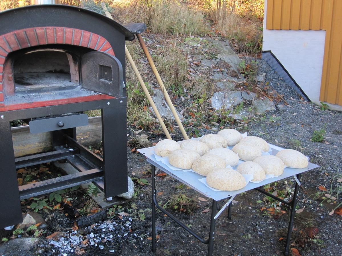 Vi fyrer opp bakerovnen, så her er det mulig å få kjøpt stenovnsbakte brød og pizza